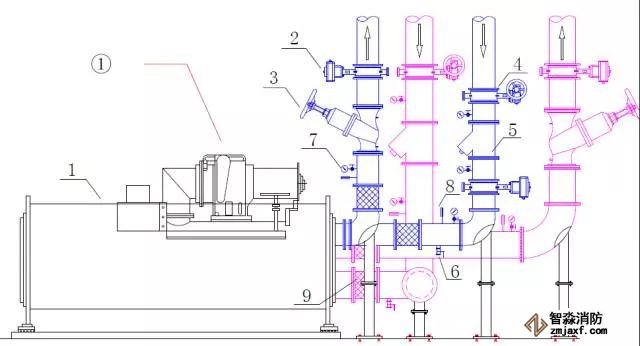 冷水機(jī)組常規(guī)接管圖:1-冷水機(jī)組,2-電動(dòng)閥,3-平衡閥,4-蝶閥,5-Y 型過(guò)濾器,6-泄水閥,7-壓力表,8-溫度計(jì),9-軟接頭。