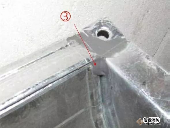 ③ 共板法蘭風(fēng)管四角制作豁口應(yīng)該打膠嚴(yán)密,打膠應(yīng)該抹平整,不出現(xiàn)堆疊現(xiàn)象。