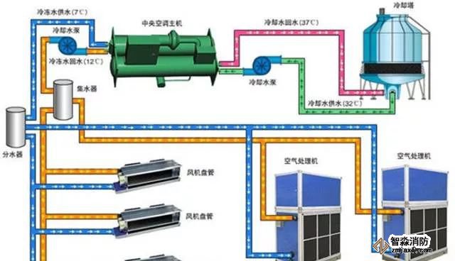典型中央空調(diào)機(jī)組主要由冷凍水循環(huán)系統(tǒng)、冷卻水循環(huán)系統(tǒng)及主機(jī)三部分組成: