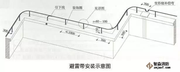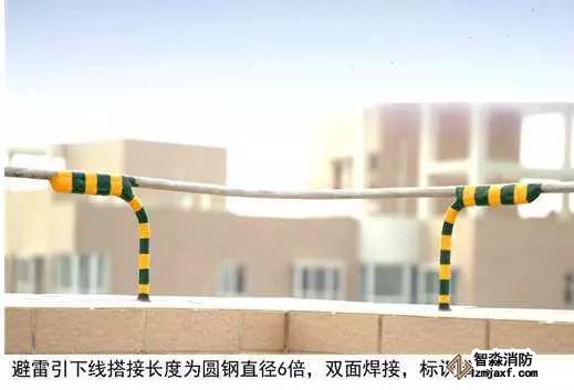 3、圓鋼避雷帶敷設:按設計位置彈線、定位,一般情況下,避雷帶應居女兒墻(屋脊)中心,當女兒墻寬度大于300mm時,支架布設于距外沿150mm處,距變形縫、轉彎300mm處設支架,直線段支架均勻分布,間距不大于1m;支架埋深不小于80mm,出女兒墻頂面不小于150mm,調(diào)整、校正支架的垂直度,根部套不銹鋼裝飾圈并用耐候膠密封固定。圓鋼調(diào)直后敷設在支架上,轉彎、搭接、變形縫處圓鋼煨彎加工,轉彎處煨彎半徑為80~100mm,搭接處一端鋼筋煨乙字彎,與另一端圓鋼上下搭接,搭接長度為100mm,搭接點宜設在離支架不小于200mm位置處,雙面施焊,焊縫連接飽滿,焊渣清理干凈,焊接點應先刷防銹漆,再刷銀粉漆,防腐處理到位;變形縫處鋼筋煨成向下半圓形。將防雷引下線可靠焊接在避雷帶上。拉通線校正避雷帶的高度、平直度。