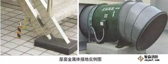 6、屋面金屬體接地:用-25x4的鍍鋅扁鋼從就近的避雷網(wǎng)引接地線,接地扁鋼一端與避雷網(wǎng)連接,另一端在金屬體附近地面引出,應高于設備基礎100~200mm。無振動設備在金屬體上直接焊接,有震動設備和非碳鋼金屬體應用編織軟銅線兩端壓端子跨接,編織軟銅線外套黃綠雙色熱縮套且熱縮。伸出地面的接地母線應刷黃綠相間油漆。體積較大的金屬體應做不小于2處的接地,高度高于避雷網(wǎng)時,應加避雷針保護。接地母線附近應做接地標識。