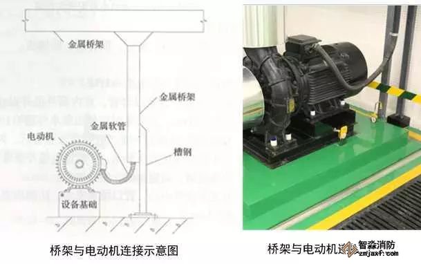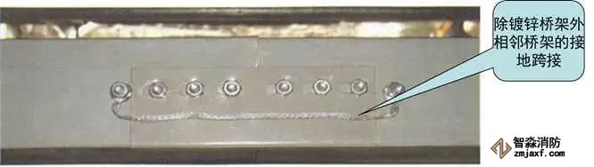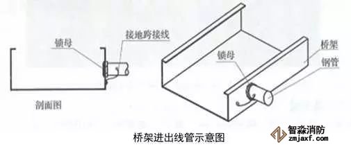 3、橋架進出線管:根據(jù)出線口位置,在橋架側面開孔,一管一孔。管端套5~6扣絲,與橋架連接內(nèi)外側采用鎖母固定,管口伸入橋架內(nèi)不大于5mm,導管與橋架采用不小于4mm²的軟銅線接地跨接。