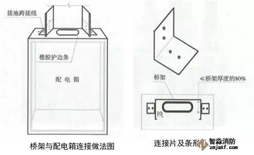 3、橋架與配電箱的連接:配電箱頂部劃線、鉆孔,用電鋸開條形孔,清理孔邊沿毛刺,孔兩端為弧形,兩端尺寸小于橋架寬度10mm左右,厚度小于等于橋架厚度的80%,孔中心與橋架中心對應,開孔處補漆,孔周邊粘貼橡膠條護口。箱體與橋架用1~1.5mm厚、90°的橋架連接片連接,連接螺栓絲頭朝外,加設專用墊片,刃面朝向橋架連接片,螺栓外露2~3扣絲。橋架與箱體采用4mm²黃綠雙色多股軟銅線或編織軟銅線接地跨接。