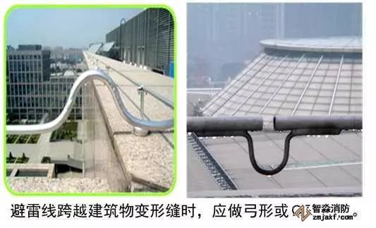 屋頂設置避雷針或避雷線,主要作用是對建筑物和屋面設備起到保護作用。其質(zhì)量控制主要為:屋面的設備、金屬構件、金屬管道、金屬支架、電氣設備金屬外殼都必須和接地干線可靠連接。避雷線安裝應平直,鍍鋅層完好,接頭應采用雙面焊接,圓鋼搭接長度6倍直徑,焊接焊口須防腐處理。引下線宜采用圓鋼或扁鋼。當采用圓鋼時,直徑不應小于8mm。當采用扁鋼時,截面不應小于48mm2,厚度不應小于4mm。對于裝設在煙囪上的引下線,圓鋼直徑不應小于12mm。扁鋼截面不應小于100mm2且厚度不應小于4mm。避雷帶跨越建筑物變形縫時,應設補償裝置。接閃器應熱鍍鋅,焊接處應涂防腐漆。在腐蝕性較強的場所,還應加大其截面或采取其他防腐措施。