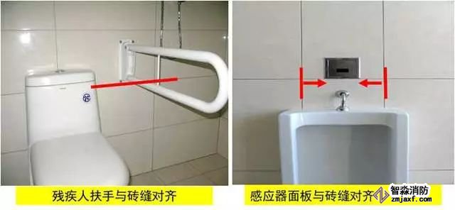 質(zhì)量控制要點:器具、排水管、配件等與墻、地面磚居中、對縫,周邊打膠光滑密實。成排器具安裝應排列整齊,高度一致,間距均勻。