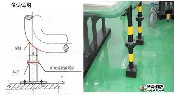 根據(jù)管道公稱直徑大小,選擇不同厚度的鋼板,加工成肋板,校正管道的垂直度,先將肋板底端焊接固定到管道周圍的支架上,再將肋板側面與管道焊接,檢查焊縫,再次校正管道垂直度,無誤后,刷防銹漆、面漆,設計要求保溫的進行管道保溫。