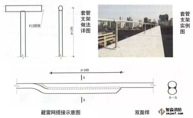 5、屋面金屬通氣管接地:采用鍍鋅扁鋼自屋面避雷網(wǎng)從透氣管根部引出,用抱箍沿透氣管固定,距根部或裝飾臺面間距300mm,根部與接地線連接,搭接長度不小于100mm,透氣管的連接部位做接地跨接。