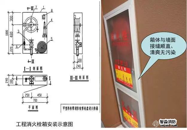 從箱門開啟側將管道接入消火栓內(nèi),栓口朝外,閥門中心距墻側面140mm(帶自救卷盤時距箱側面250mm),距箱里側表面100mm。螺紋連接時應有2~3扣的外露絲扣,清理干凈絲扣處的麻絲,并做防腐處理。消防控制按鈕安裝在箱門開啟處、箱內(nèi)側的最上部,并注意電氣專業(yè)的配合。除箱門安裝玻璃者以及能被擊碎的透明材料外,均應設置箱門緊急開啟的手動機構,與墻面交接清爽無污染。