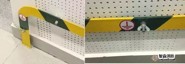 7、高層建筑管道頂部和底部接地:有接地預埋鋼板或垂直接地母線上引接接地母線,接地母線距地300~500mm,距墻10~15mm,并間隔100mm刷45°斜向黃綠相間油漆。將于管徑相匹配的接地抱箍安裝于管道上,抱箍必須與金屬體緊密接觸,編織軟銅線一端與抱箍連接,另一端與接地母線連接,螺栓連接處應加平墊片和彈簧墊片。DN≥100mm時,采用10mm²編織軟銅線,DN≤80mm時,采用4mm²編織軟銅線。