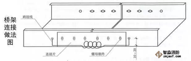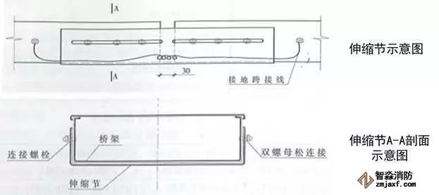 4、伸縮節(jié)安裝:當橋架經(jīng)過建筑伸縮縫或橋架直線長度大于30m(鋁合金及其他材料直線段長度大于15m)時,應設置伸縮節(jié),伸縮節(jié)應設置在伸縮縫位置或直線長度的中間。伸縮節(jié)兩側各設置一個支架,支架與伸縮節(jié)端部距離不大于500mm。伸縮節(jié)補償收縮襯板應設在伸縮節(jié)外側,襯板螺栓孔應開成條形孔,襯板長度為兩個連接板長度之和加30mm,雙螺母應位于橋架外側,且不能擰緊,以保證自由伸縮。伸縮節(jié)兩端橋架應采用軟銅線做接地跨接,接地線中間應留有余量。