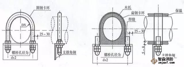選擇與管徑匹配的卡環(huán),卡環(huán)安裝固定螺栓孔應保證管道順直且居卡環(huán)中間,卡環(huán)與管道應接觸緊密。圓鋼卡環(huán)與不銹鋼管、銅管連接固定時,卡環(huán)應套塑料保護軟管,管道與支架間接觸面應墊與角鋼同寬的隔離橡膠墊。扁鋼卡環(huán)應與木托同寬,與螺栓應滿焊連接;在與支架連接處應垂直,扁鋼端部與支架宜留有5~8mm收縮余量,卡環(huán)端部外露支架的螺栓宜采用圓頭螺帽收頭,油漆涂刷應均勻。
