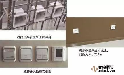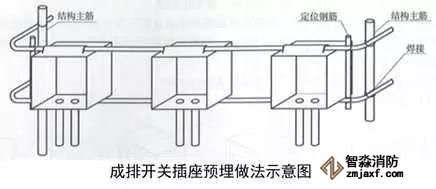 2、成排開關插座盒安裝:根據(jù)結構500mm線和結構墻面線,確定成排線盒的高度及位置,墻內(nèi)主筋上做標記,上下用兩根鋼筋穿接線盒,兩側加短鋼筋與結構立筋焊接定位,盒口與模板面平齊,固定端正牢靠,間距均勻。