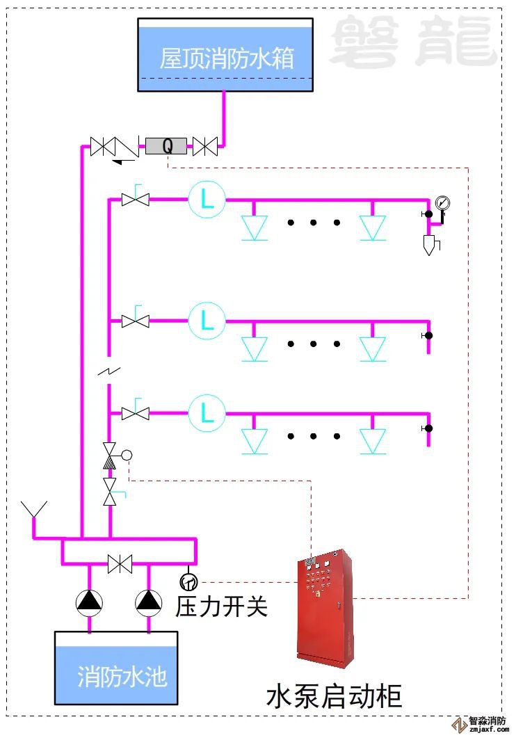 根據(jù)《消防給水及消火栓系統(tǒng)技術(shù)規(guī)范》GB50974-2014 要求:消防水泵出水干管上設(shè)置的壓力開關(guān)、高位消防水箱出水管上的流量開關(guān),或報(bào)警閥壓力開關(guān)等開關(guān)信號(hào)應(yīng)能直接自動(dòng)啟動(dòng)消防水泵。(11.0.4)