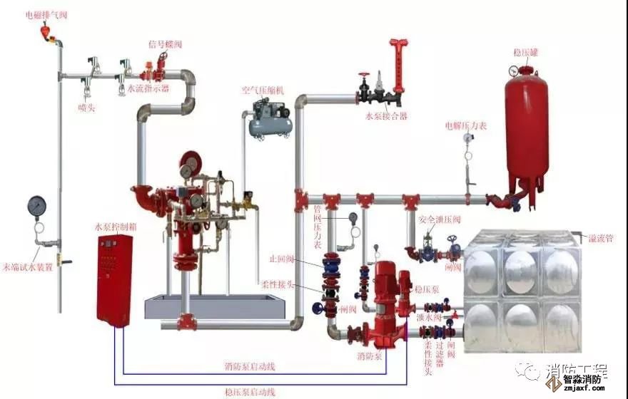 預(yù)作用系統(tǒng)在準(zhǔn)工作狀態(tài)時配水管道內(nèi)不充水,由火災(zāi)自動報警器自動開啟預(yù)作用閥后,轉(zhuǎn)換為濕式系統(tǒng),預(yù)作用系統(tǒng)由閉式噴頭、預(yù)作用閥組、充氣設(shè)備(不是必須有)、水流報警裝置、供水設(shè)施及供水配水管道等組成。