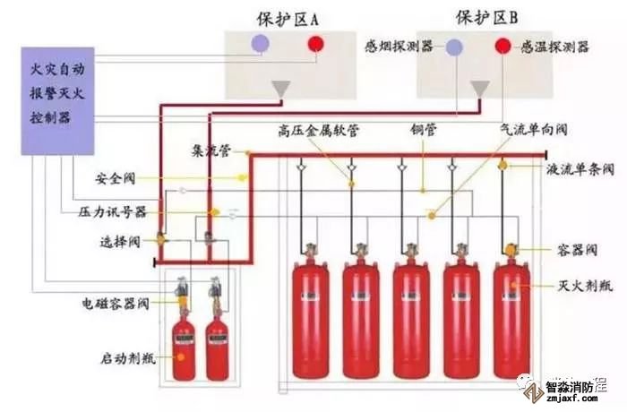 5)氣體滅火防護(hù)區(qū)出口外上方應(yīng)設(shè)置表示氣體噴灑的火災(zāi)聲光警報器,指示氣體釋放的聲信號應(yīng)與該保護(hù)對象中設(shè)置的火災(zāi)聲警報器的聲信號有明顯區(qū)別。啟動氣體滅火裝置、泡沫滅火裝置的同時,應(yīng)啟動設(shè)置在防護(hù)區(qū)入口處表示氣體噴灑的火災(zāi)聲光警報器;組合分配系統(tǒng)應(yīng)首先開啟相應(yīng)防護(hù)區(qū)域的選擇閥,然后啟動氣體滅火裝置、泡沫滅火裝置。