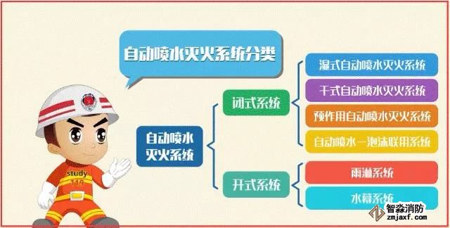 自動(dòng)噴水滅火系統(tǒng)根據(jù)所使用噴頭的型式,可分為閉式自動(dòng)噴水滅火系統(tǒng)和開(kāi)式自動(dòng)噴水滅火系統(tǒng)兩大類。