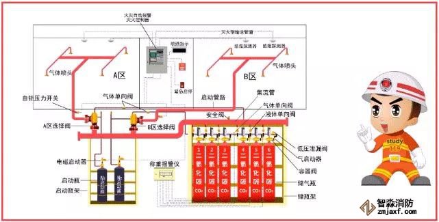 該系統(tǒng)由滅火劑瓶組、加壓氣體瓶組、驅(qū)動(dòng)氣體瓶組(可選)、單向閥、選擇閥、減壓裝置、驅(qū)動(dòng)裝置、集流管、連接管、噴頭、信號(hào)反饋裝置、安全泄放裝置、控制盤、檢漏裝置、管道管件及吊鉤支架等組成。