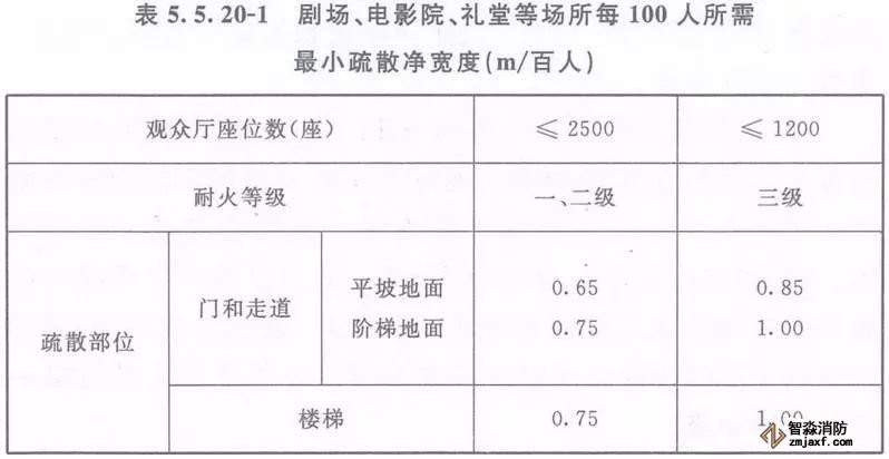2、劇場(chǎng)、電影院、禮堂等場(chǎng)所供觀眾疏散的所有內(nèi)門(mén)、外門(mén)、樓梯和走道的各自總凈寬度,應(yīng)根據(jù)疏散人數(shù)按每100人的最小疏散凈寬度不小于表5.5.20-1的規(guī)定計(jì)算確定;