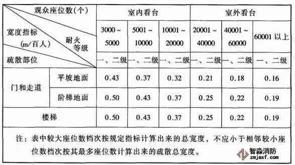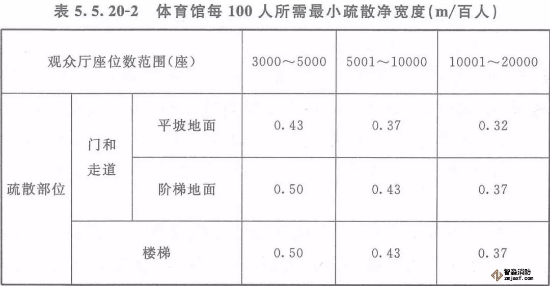 注:本表中對(duì)應(yīng)較大座位數(shù)范圍按規(guī)定計(jì)算的疏散總凈寬度,不應(yīng)小于對(duì)應(yīng)相鄰較小座位數(shù)范圍按其最多座位數(shù)計(jì)算的疏散總凈寬度。對(duì)于觀眾廳座位數(shù)少于3000個(gè)的體育館,計(jì)算供觀眾疏散的所有內(nèi)門(mén)、外門(mén)、樓梯和走道的各自總凈寬度時(shí),每100人的最小疏散凈寬度不應(yīng)小于表5.5.20-1的規(guī)定。