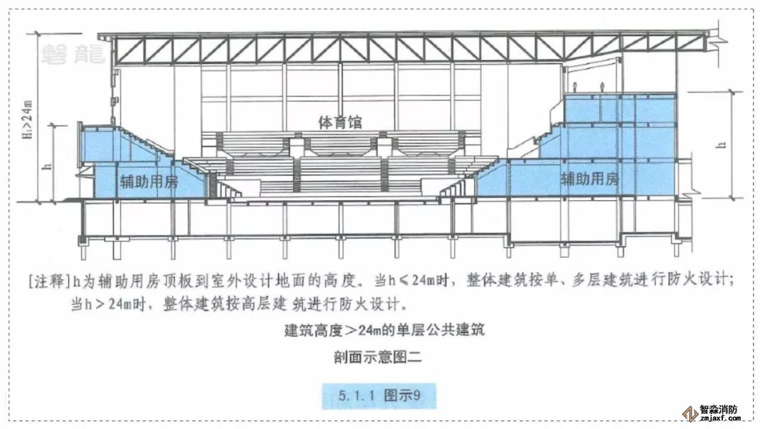 三、建筑高度大于24m的單層體育館,當(dāng)輔助用房的高度小于24m時(shí),仍可不劃分為高層建筑。