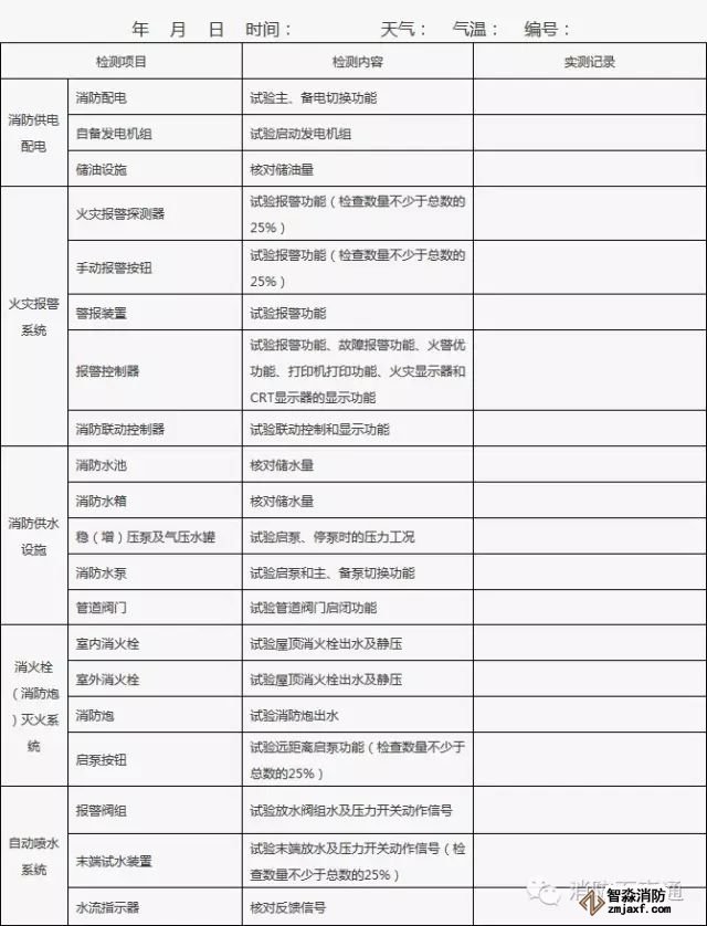 1、建筑消防設(shè)施的單項檢查應(yīng)當(dāng)每月至少一次,并填表。