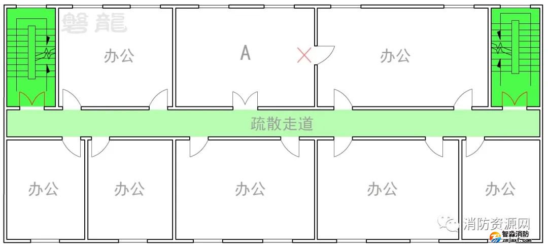 圖示5的辦公室A需要兩個(gè)疏散門,疏散門應(yīng)直接通向疏散走道,不應(yīng)通過其他房間疏散。
