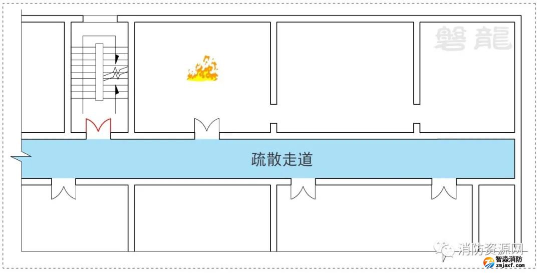 三、人員疏散過程中,從危險(xiǎn)區(qū)域(房間等)應(yīng)進(jìn)入次危險(xiǎn)區(qū)域(疏散走道等)或相對(duì)安全區(qū)域、安全區(qū)域,不應(yīng)通過其他危險(xiǎn)區(qū)域疏散,示例: