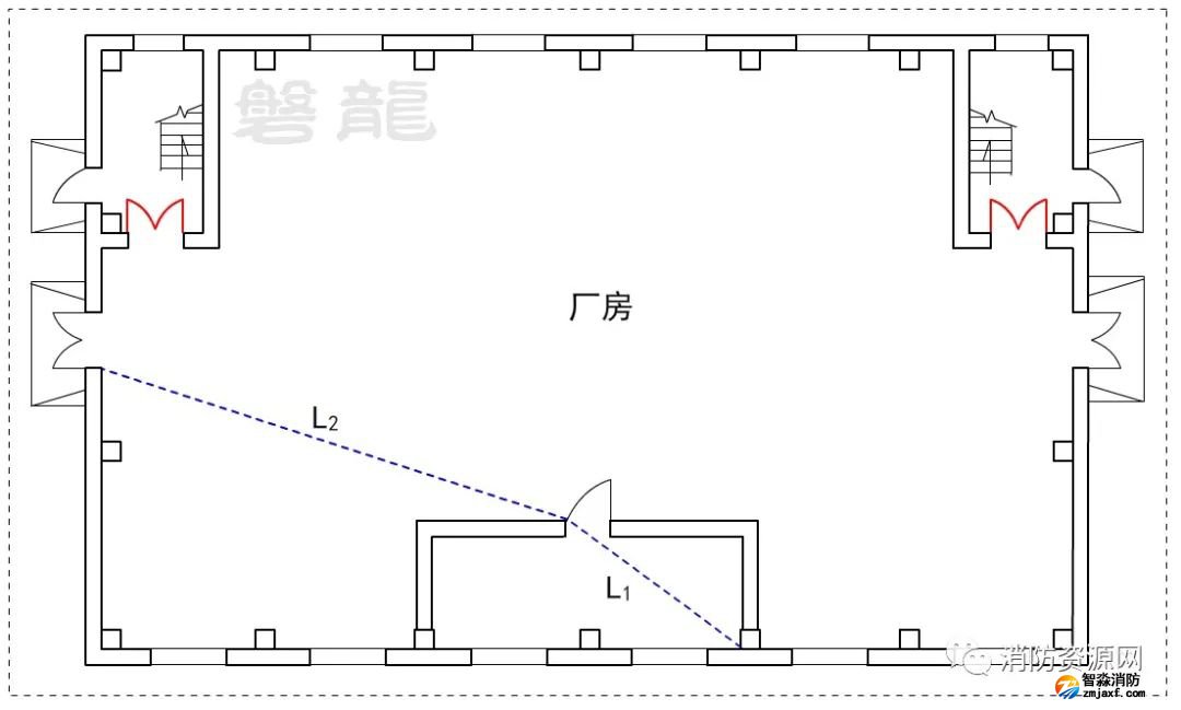 2、廠房倉(cāng)庫(kù)同樣不應(yīng)采用嵌套(穿套)設(shè)置的方式,確因功能需要,嵌套(穿套)設(shè)置的房間不應(yīng)超過一級(jí),疏散距離應(yīng)按人員行走的直線距離計(jì)算,在圖示7的廠房中,示例房間內(nèi)任一點(diǎn)至安全出口的直線距離,應(yīng)為L(zhǎng)1+L2。