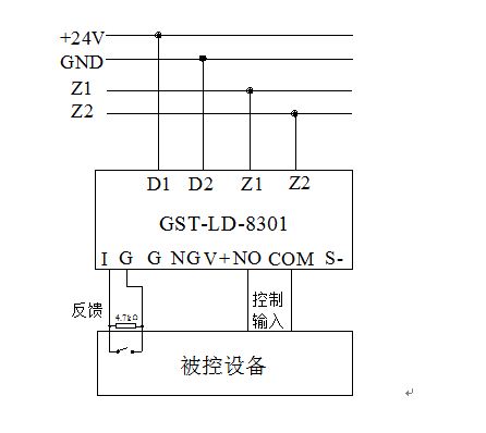 Z1、Z2:接火災(zāi)報(bào)警控制器信號(hào)二總線,無極性