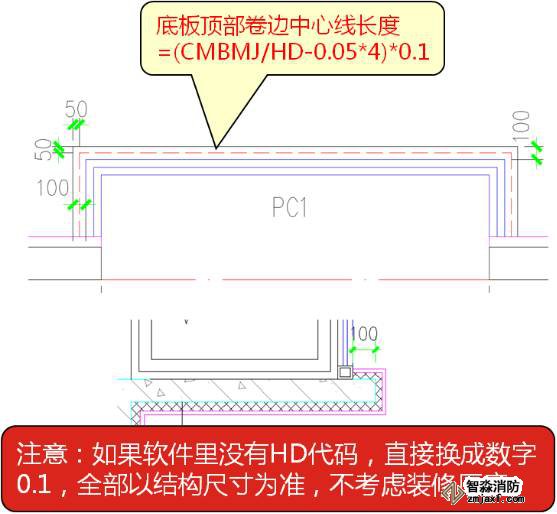 估計(jì)很多朋友看不懂“(CMBMJ/HD-0.05*4*0.1”,我解釋下,CMBMJ是飄窗底板側(cè)面模板面積,除以HD(厚度)就是側(cè)面長(zhǎng)度,減去0.05*4就是我們要求底板裝修上翻的中心線長(zhǎng)度,在乘以0.1就是上翻的面積。