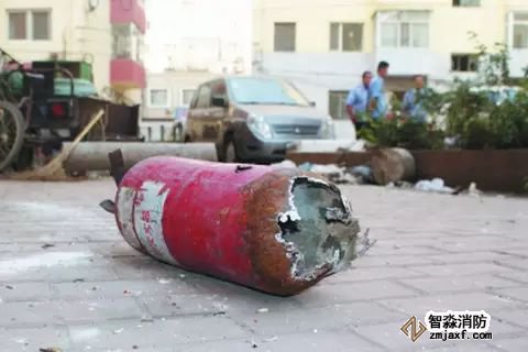 2013年2月,新疆一個電器商場發(fā)生滅火器爆炸事故,墻角的瓶裝滅火器已經(jīng)變成一張鐵皮。