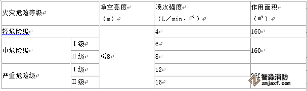 噴頭的布置應(yīng)符合中危險(xiǎn)級(jí)Ⅰ級(jí)場(chǎng)所,作用面積應(yīng)符合: