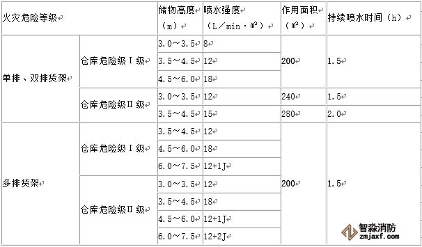 注:1.無包裝的塑料橡膠視同紙袋、塑料袋包裝。 2.貨架內(nèi)置噴頭應(yīng)采用與頂板下噴頭相同的噴水強(qiáng)度,用水量應(yīng)按開放6只噴頭確定。 |