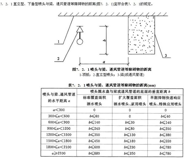 直立型灑水噴頭濺水盤與頂板的距離應(yīng)為75mm~150mm,并應(yīng)符合下列規(guī)定:1 當(dāng)在梁或其他障礙物底面下方的平面上布置灑水噴頭時,濺水盤與頂板的距離不應(yīng)大于300mm,同時濺水盤與梁等障礙物底面的垂直距離應(yīng)為25mm~100mm。2 當(dāng)在梁間布置灑水噴頭時,灑水噴頭與梁的距離應(yīng)符合本規(guī)范第7.2.1條的規(guī)定。確有困難時,濺水盤與頂板的距離不應(yīng)大于550mm。梁間布置的灑水噴頭,濺水盤與頂板距離達(dá)到550mm仍不能符合本規(guī)范第7.2.1條的規(guī)定時,應(yīng)在梁底面的下方增設(shè)灑水噴頭。3 密肋梁板下方的灑水噴頭,濺水盤與密肋梁板底面的垂直距離應(yīng)為25mm~100mm。