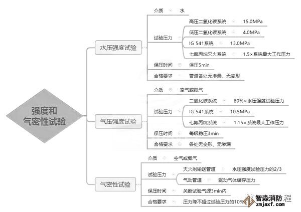 1.滅火劑輸送管道安裝完畢后,應(yīng)進行強度試驗和氣壓嚴密性試驗,并合格。