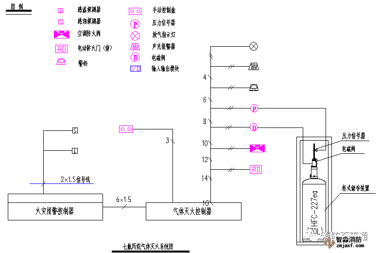 下面簡述一下該氣體滅火系統(tǒng)的組成方式,即參照《火災自動報警系統(tǒng)設計規(guī)范》GB50116-2013第4.4.3條,氣體滅火控制器、泡沫滅火控制器不直接連接火災探測器的組成方式,火災報警控制器設置在消防監(jiān)控中心,防護區(qū)設置的感煙探測器和感溫探測器直接連接到消防控制中心的集中報警控制器上,消防控制中心的火災報警控制器通過總線控制模塊聯(lián)動切除空調系統(tǒng)和防火閥,關閉防火卷簾門等;氣體滅火控制器設置在防護區(qū)的鋼瓶組附近,連接防護區(qū)內的聲光報警器和防護區(qū)外的聲光報警器、以及啟動鋼瓶的電磁閥和氣體釋放的壓力開關信號機放氣指示門燈,現(xiàn)場緊急釋放和啟停按鈕設置在防護區(qū)門口。