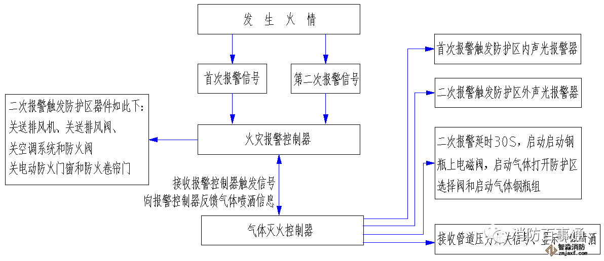 首先觸發(fā)信號防護區(qū)域內任一設置的感煙火災探測器作為首個聯(lián)動觸發(fā)信號后,火災報警控制器接收到第一報警信號,同時氣體滅火控制盤接到火災報警控制器的聯(lián)動請求,啟動設置在該防護區(qū)內的火災聲光警報器;再觸發(fā)感溫探測器或手動火災報警按鈕的報警信號,火災報警控制器接收到第二個報警信號,聯(lián)動該防護區(qū)內的相關設備如:停止排風機、關閉排風閥、關閉空調電源和送風管道上的防火閥,關閉防火門窗和降下防火卷簾門;同時氣體滅火控制盤接到火災報警控制器的第二次聯(lián)動請求,啟動設置在該防護區(qū)外的火災聲光警報器;延時30秒后,開啟氣體啟動鋼瓶上的電磁閥,啟動氣體通過傳動管開啟相關區(qū)域的選擇閥和打開對應的FM200鋼瓶組,氣體噴灑到該保護區(qū)域,氣體傳送管道上的壓力開關有回答信號,同樣保護區(qū)外的“放氣勿入”指示燈點亮;氣體釋放的信息反饋到火災報警控制器上。