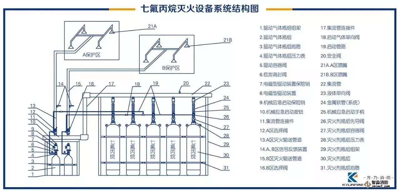 七氟丙烷滅火設(shè)備需要設(shè)置專用的設(shè)備間,用一套或一套以上的貯存裝置保護一個或一個以上的保護區(qū)(總保護區(qū)數(shù)量≤8個,總保護區(qū)體積≤3600m³),使用管網(wǎng)將滅火劑輸送到保護區(qū)的系統(tǒng)。