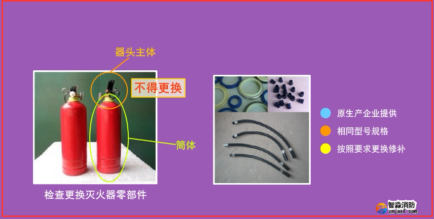 對(duì)滅火器零部件檢查后,更換密封件和損壞的零部件,但不得更換滅火器筒體和器頭主體。所有需要更換的零部件應(yīng)采用原生產(chǎn)企業(yè)提供、推薦的相同型號(hào)規(guī)格的產(chǎn)品,并按照下列要求更換、修補(bǔ)零部件: