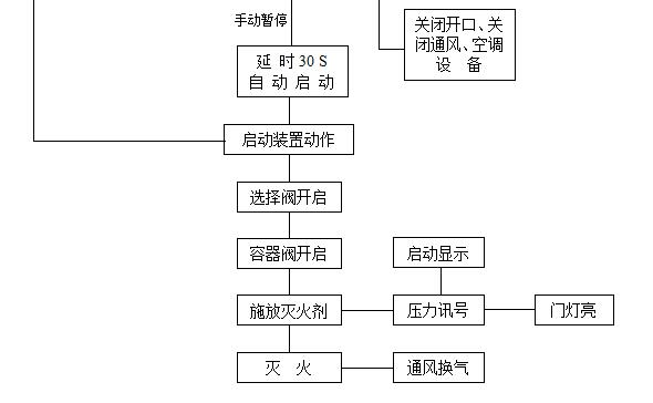 發(fā)生火災(zāi)時(shí),當(dāng)一路探測(cè)器報(bào)警后,設(shè)在該防護(hù)區(qū)域內(nèi)的警鈴動(dòng)作;兩路探測(cè)器都報(bào)警后,設(shè)在該防護(hù)區(qū)域內(nèi)外的蜂鳴器及閃燈動(dòng)作;系統(tǒng)進(jìn)入延時(shí)階段,控制盤(pán)完成相關(guān)設(shè)備的聯(lián)動(dòng)控制。經(jīng)過(guò)延時(shí)后,控制盤(pán)輸出24V直流信號(hào)電源啟動(dòng)儲(chǔ)氣瓶組上的電磁閥,打開(kāi)儲(chǔ)氣瓶組釋放滅火劑氣體,滅火劑沿噴射短管和噴頭輸送到防護(hù)區(qū)域滅火。如值班人員先于火災(zāi)探測(cè)系統(tǒng)發(fā)現(xiàn)火情,當(dāng)用手提式滅火器或其它移動(dòng)式滅火設(shè)備無(wú)法撲滅火災(zāi)時(shí),可直接手動(dòng)啟動(dòng)來(lái)滅火。如發(fā)現(xiàn)是系統(tǒng)誤動(dòng)作,或確有火災(zāi)發(fā)生但僅使用手提式滅火器和其它移動(dòng)式滅火設(shè)備即可撲滅火災(zāi),可按下設(shè)在防護(hù)區(qū)域門(mén)外的緊急止噴按鈕,可以使系統(tǒng)暫時(shí)停止釋放藥劑。如需繼續(xù)開(kāi)啟氣體滅火系統(tǒng),則只需松開(kāi)緊急停止開(kāi)關(guān)即可。