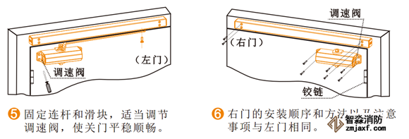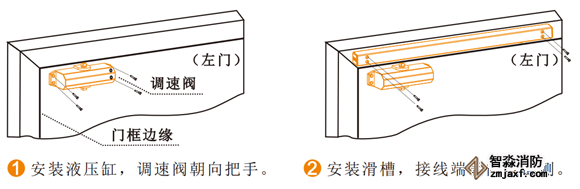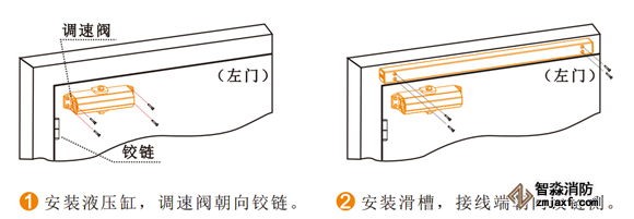 4) 確定好電動(dòng)閉門器的安裝方向(拉門側(cè)或推門側(cè))安裝閉門器滑槽及液壓缸;